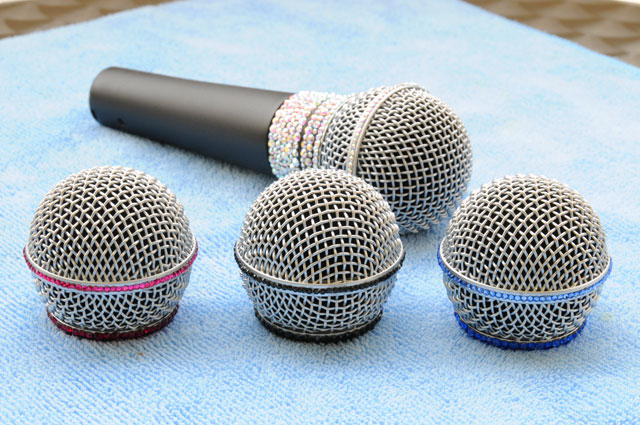 本物のスワロフスキーを大小100個以上惜しげもなくちりばめたこのマイクは照明の光が当たると虹色に輝きます☆